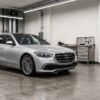 A sleek, modern luxury sedan parked in front of a minimalist Japanese urban background.