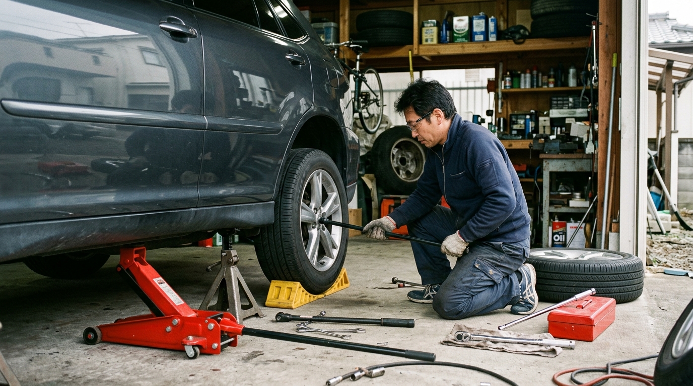 スタッドレスタイヤ用のホイールをすでに別で持っている場合、タイヤをホイールごと入れ替えるだけの「履き替え」作業は、正しい工具と手順があれば自分でも対応できる範囲です。